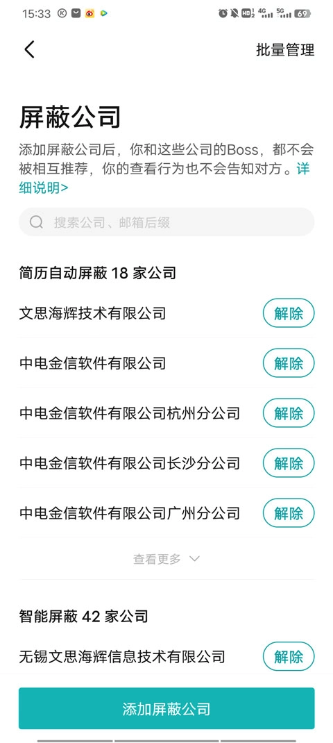 4、输入您希望屏蔽的公司名称,点击“添加屏蔽公司”按钮即可完成操作。