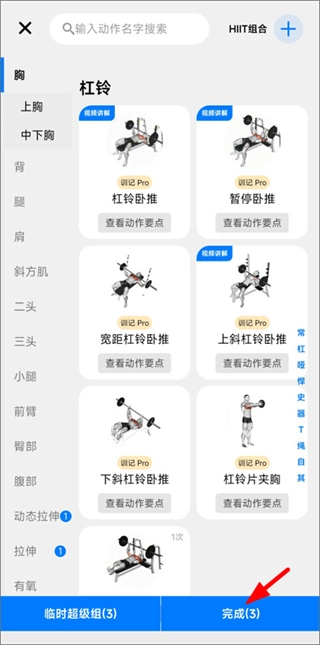 4、进入动作添加界面后,用户可依据自身锻炼需求挑选适宜的锻炼动作,随后点击完成按钮即可。