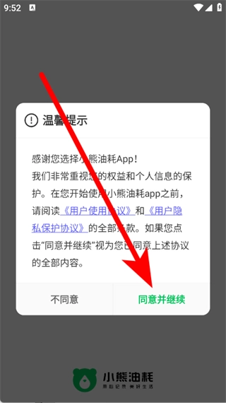 1、打开小熊油耗,在弹窗中点击同意并继续,进入登录方式选择页面。