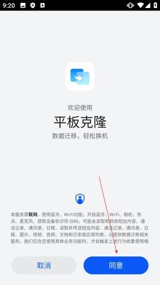 1、在平板克隆启动界面,点击【同意】,进入权限提示界面。