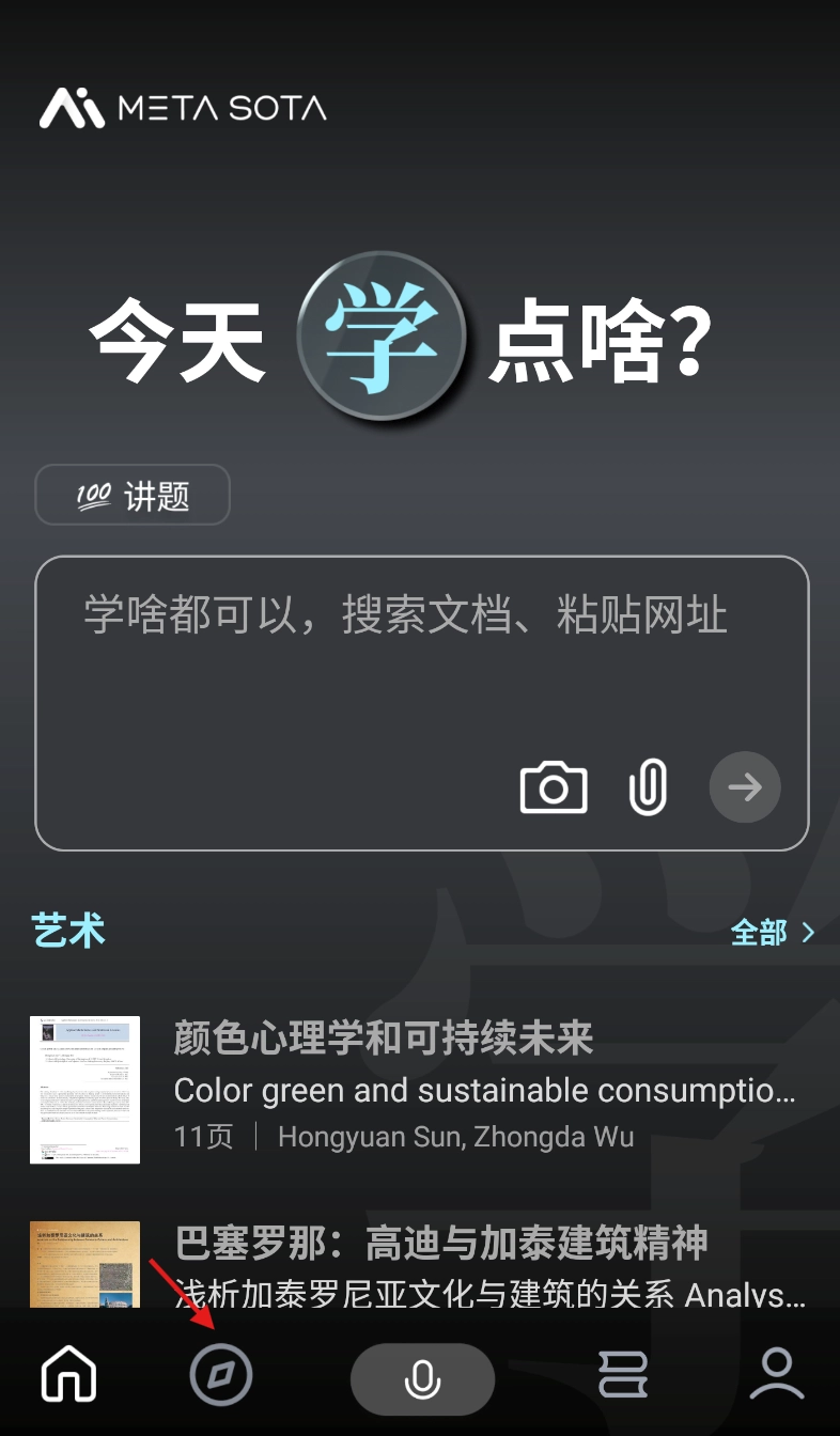 1、打开 “今天学点啥”,在软件首页界面找到并点击 “探索” 选项。