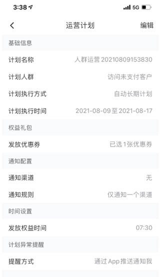 3、创建新的人群运营计划列表 进入人群运营列表页面后,点击右上角的“新建计划”按钮。依次完成基础信息的填写,选择对应的计划人群、计划执行方式以及计划执行时间。接着进行优惠券权益的设置,该环节支持选择多张优惠券,且针对每种优惠券,最多可发放10张。之后设定权益的发放时间。待所有设置项均确认无误后,即可完成计划的创建。