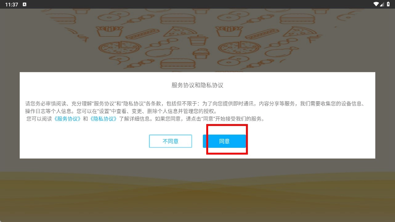 1、在服务协议和隐私协议界面,点击【同意】,进入登录环节。
