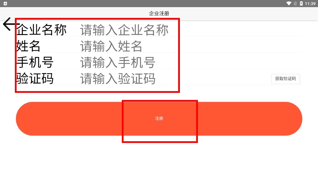 3、企业注册流程如下:需依次输入企业名称、姓名与手机号,获取并填写验证码后,点击【注册】按钮,即可完成企业账号的注册操作。