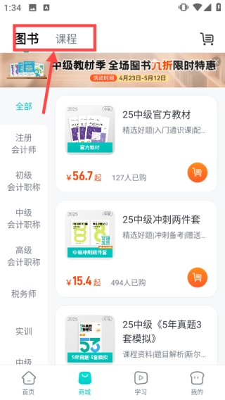 2、切换到商城界面,可以在此购买图书或者课程