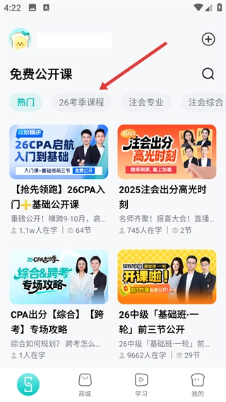 1、打开斯尔教育,在免费公开课板块点击【26考季课程】,切换到对应考季的课程列表呢。