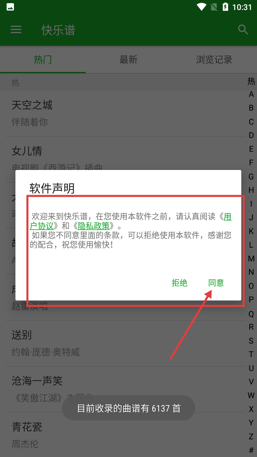 1、首次进入【快乐谱】软件,会弹出【软件声明】窗口,点击【同意】方可继续使用软件。