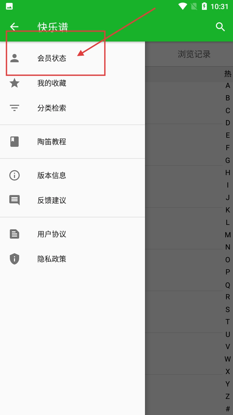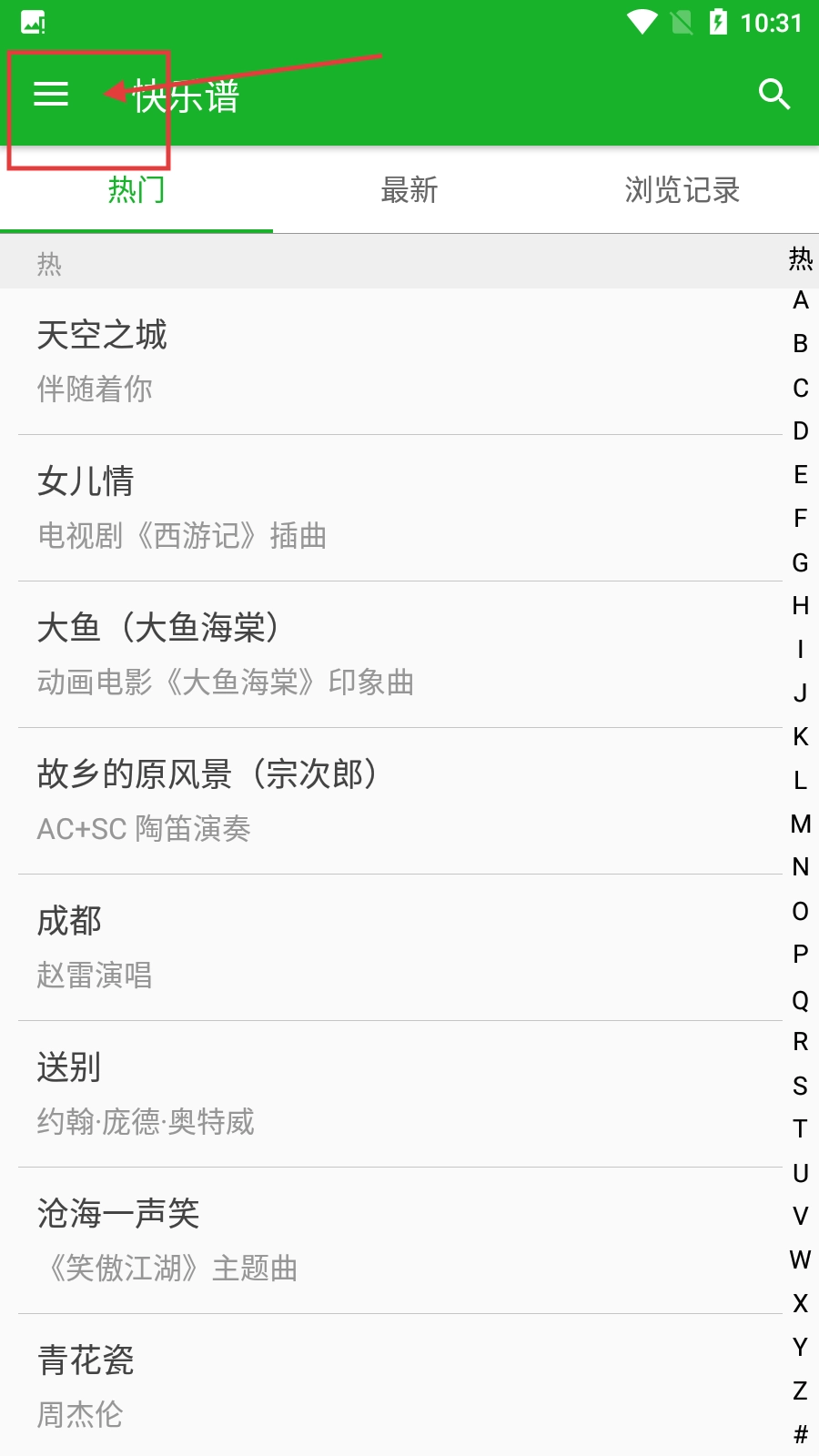 2、在【快乐谱】主界面,点击左上角的三条横线图标(菜单按钮),可展开功能菜单。