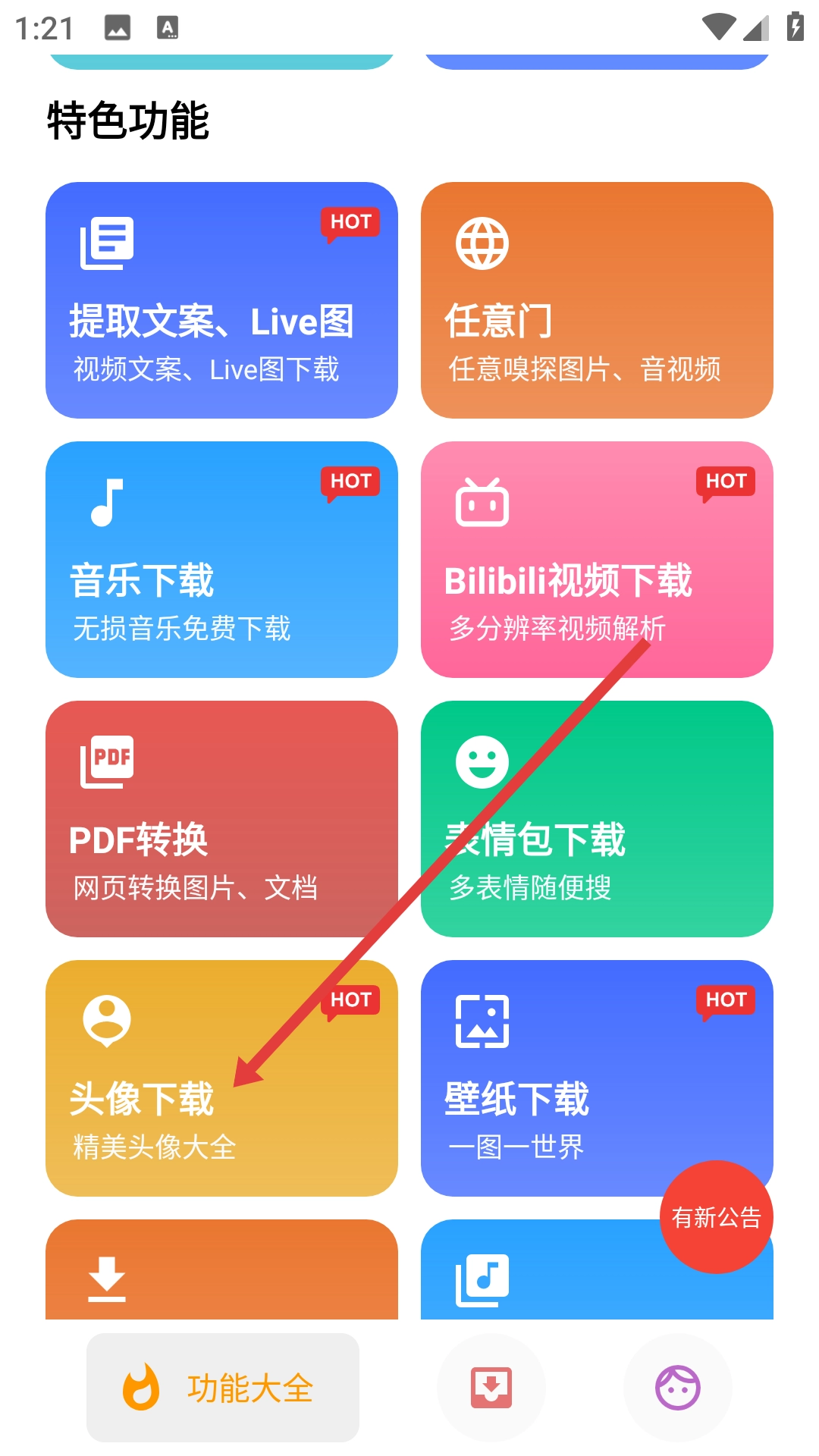 进入特色功能页面后,点击「头像」选项,即可进入头像分类页面。