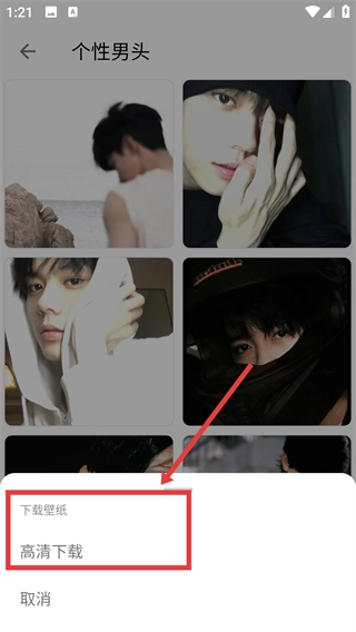 3、在个性男头的头像列表页面,点击目标头像后,会弹出选项菜单。