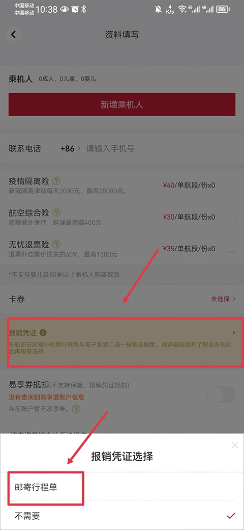 4、然后在资料填写界面中点击报销凭证,选择邮寄行程单。