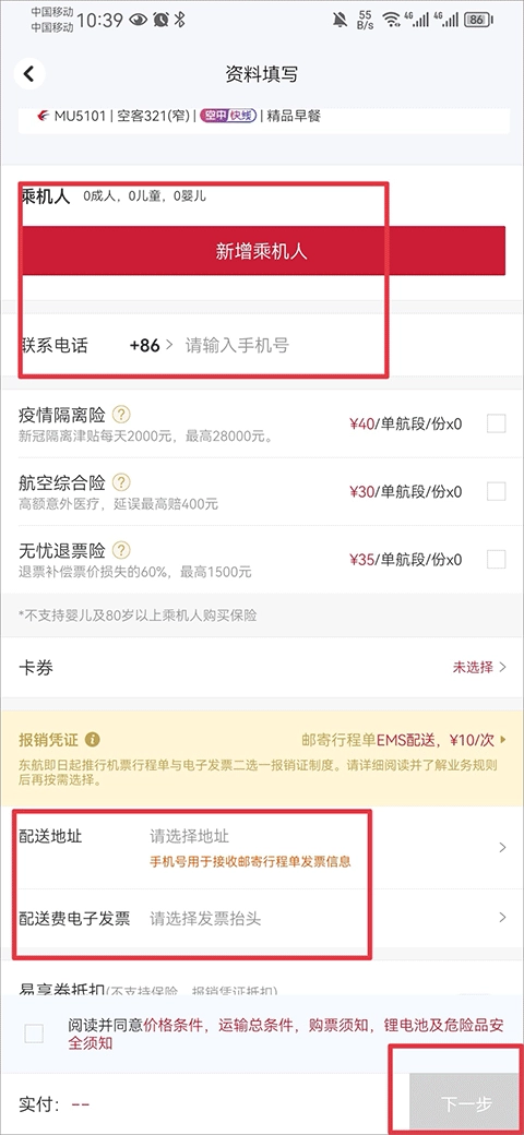 5、接着把发票的邮寄地址、发票抬头和乘机人信息补充完整,之后点击下一步。