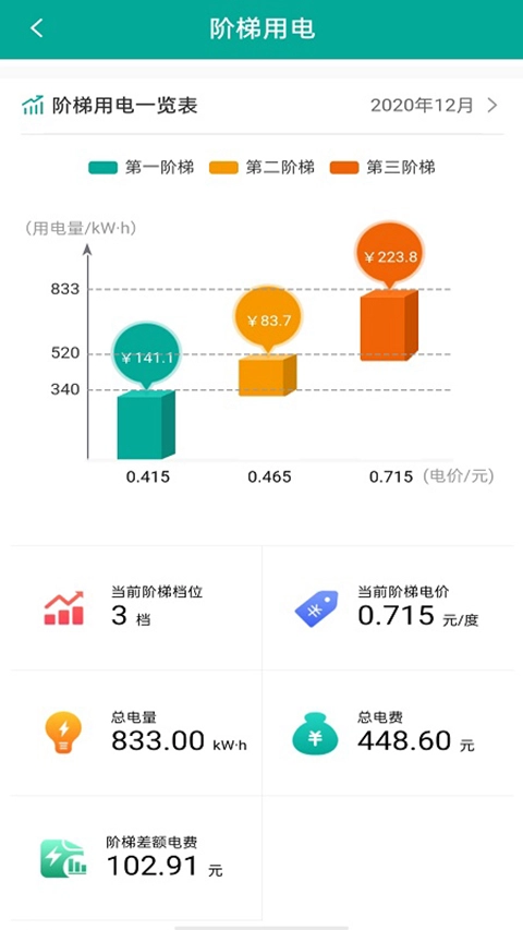 2、电量电费:呈现近12个月的用电总量与详细数据,帮助用户清晰了解自身用电状况。