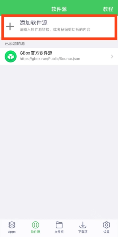 1. 启动GBox软件,依次点击软件源、添加软件源选项,复制需添加的软件源链接后完成添加操作