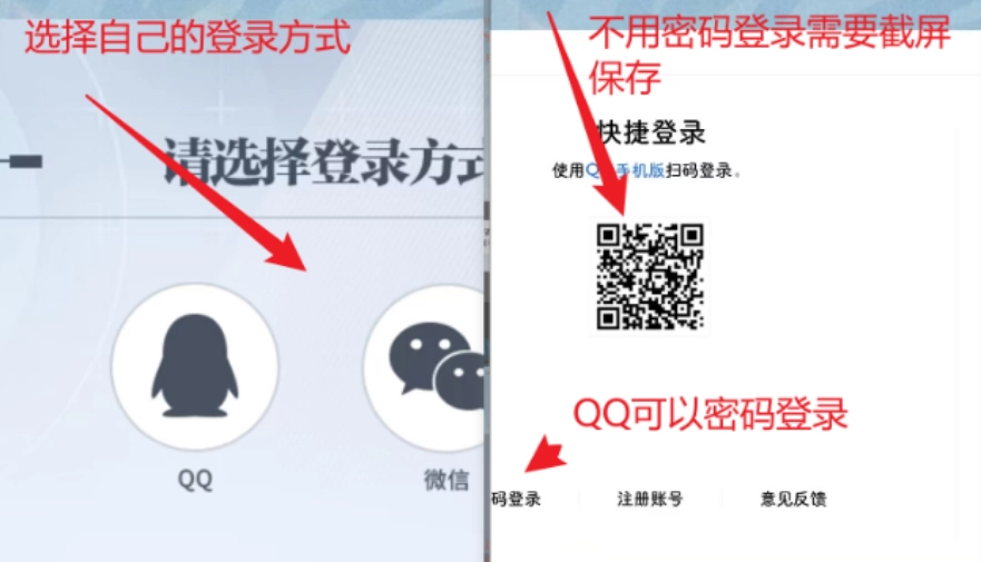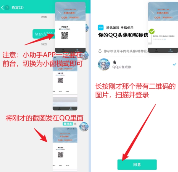 4、此时请不要离开小助手,建议先截图保存二维码,再将小助手切换为小窗模式悬浮在屏幕上,之后把二维码发送到QQ或微信。注意:QQ用户可长按二维码登录,也能选择密码登录;微信则仅支持扫码登录,这需要准备两个手机,或者把小助手安装在电脑的安卓虚拟机中使用。