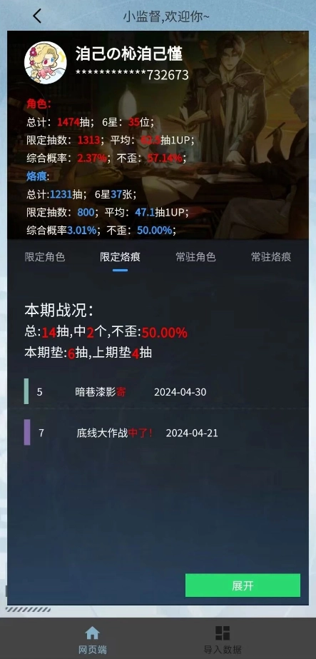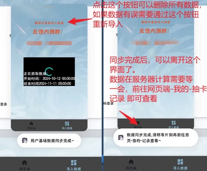 5、登录操作完成后,小助手会自动进行数据抓取,您只需等待进度条加载结束,就能前往网页端查看抽卡记录了。要是发现抽卡记录存在错误,您可以点击导入数据页面顶部的删除数据按钮,在确认操作后重启小助手,然后重新导入数据就可以啦。