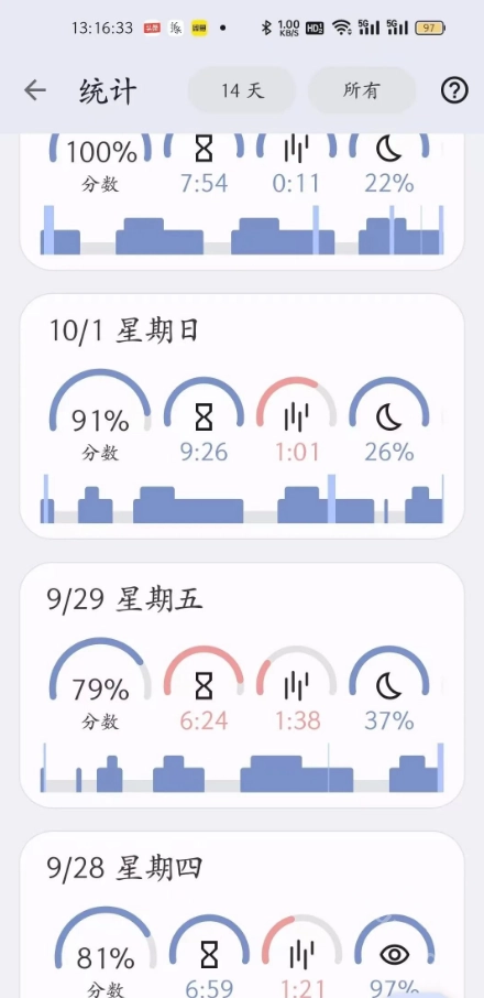 2. 每日睡眠监测的完整统计,在这里你可以查看每一天的睡眠质量及深度睡眠时间,帮助你更全面地了解自身的睡眠状况。