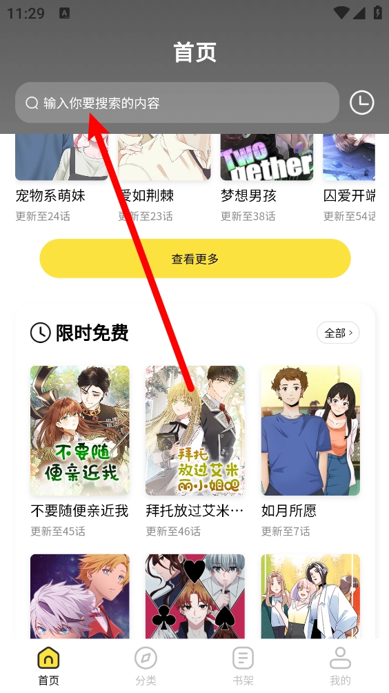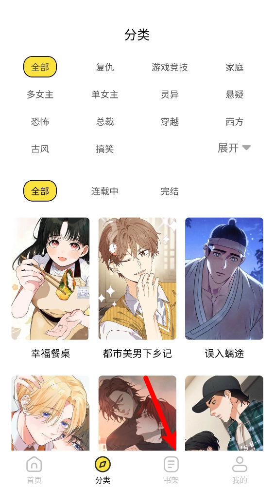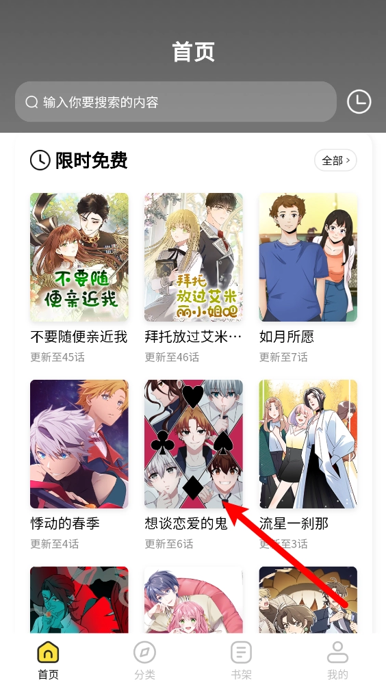 3、最后点击箭头指向的书架进入,就能查看已加入的漫画。