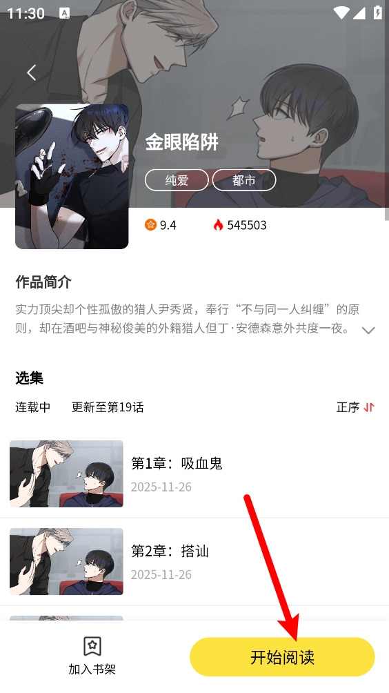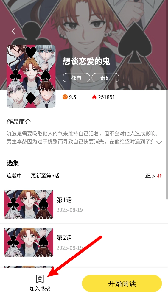 2、在漫画详情页点击左下角"加入书架"按钮。