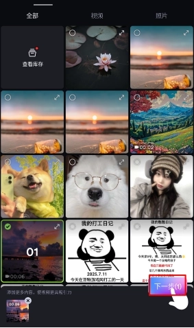3、然后选择所需裁剪的视频,点击"下一步"。