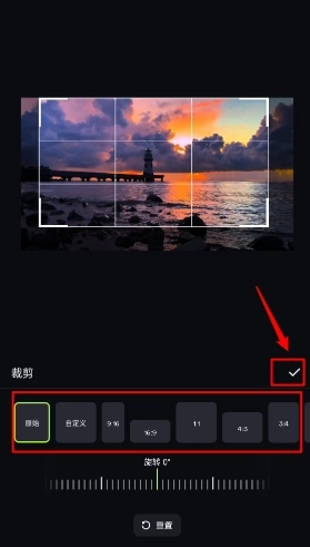 5、如图所示,你可以选择裁剪比例,也能直接调整裁剪尺寸,操作完成后点击“对钩”按钮,就能完成裁剪操作。