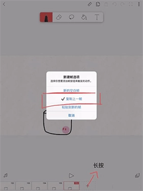 2、长按+号,选择复制上一帧,然后点+号键都是上一帧
