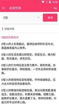 3、在主界面找到“血型性格”选项并点击,接着输入你想查询的血型,最后点击查询按钮,就能查看对应的相关信息了。