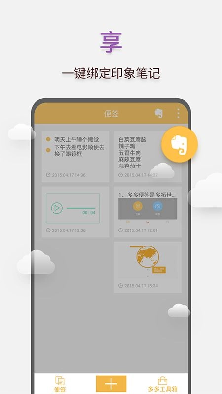 1、多多便签支持与印象笔记进行绑定,绑定后便签里的内容能够同步到印象笔记中。