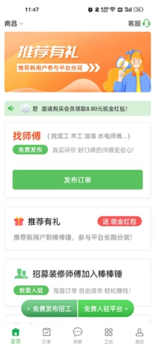 棒棒锤是深圳市好工匠网络科技有限公司开发的一款专门用于寻找装修长工师傅的软件。房子装修时找不到技术精湛的师傅,或者缺人手时找不到经验丰富的长工,这些问题都能在这里得到解决。棒棒锤平台汇聚了大量装修师傅资源,会帮客户做好师傅的筛选与管理工作,是装修公司和工长找师傅的常用工具。平台支持极速响应,10秒即可完成下单,师傅会在30分钟内抢单。此外,还提供更专业的维修安装服务,适合有相关需求的用户,致力于带来优质的服务体验。