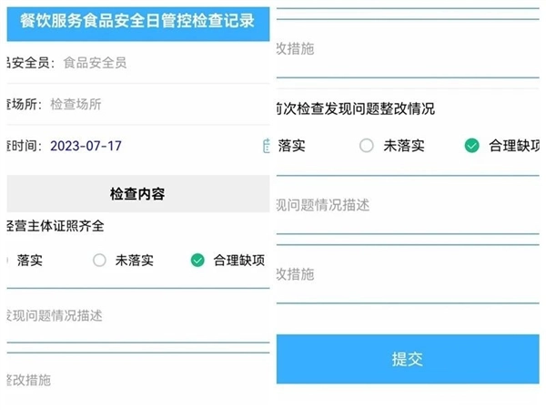 3、填写“日管控”信息后提交。食品安全员填写从业人员姓名,检查场所填写店名