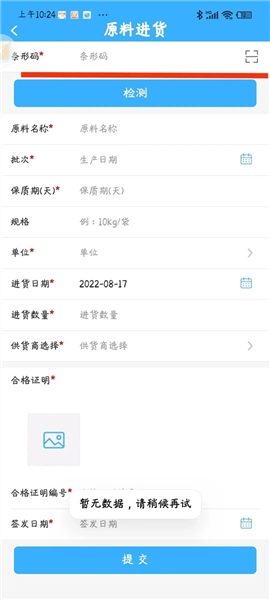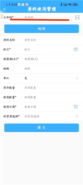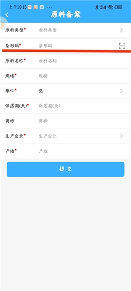9、第一步是输入条形码,此处需输入的条形码为原料备案时所编写的条形码。输入该条形码后,其他项目内容会自动显示,仅需填写购进数量等相关内容即可。产品生产所需的各类原料,必须逐一通过“添加”操作来完成原料购进流程。原料使用台账方面:原料购进后会进入企业库存,企业每次生产时,可根据实际需求使用原料,此时点击右上角的“添加”按钮,重复上述操作即可。需要注意的是,条形码只能输入备案过的原料条形码,若条形码不正确,则无法进行原料的购进或使用操作。