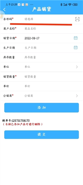11、首先输入此前“产品备案”环节中已备案产品的条形码,接着填写生产日期、数量等信息,提交后即完成生产流程。(特别提醒:生产数量务必依据实际情况准确填写) 产品销货台账:产品销售是企业运营的核心目标,因此这一环节至关重要。通过产品销货台账功能,可直接打印“电子一票通”,该凭证能够替代传统的“五证一票”使用。具体操作步骤如下:点击“产品销货台账”模块,再点击右侧的“添加”按钮,系统将弹出“产品销货台账”的操作页面。