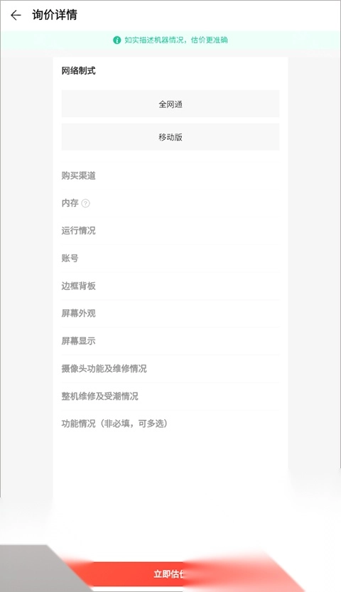 4、描述你的手机格式、以及购买渠道、内存、外观等信息后,点击“立即估价”
