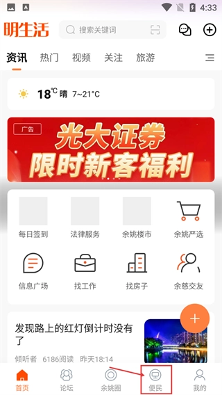 1、打开【明生活】软件首页,能查看本地资讯与天气信息,通过底部的【首页】【论坛】【余姚圈】【便民】【我的】选项卡切换,可快速找到所需功能。