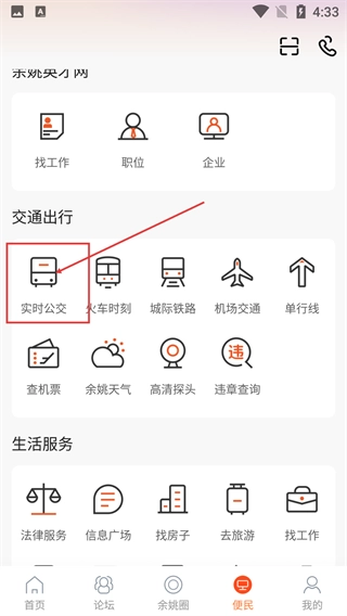 在【便民】页面里,【交通出行】分类下设有【实时公交】入口,同时还包含火车时刻、违章查询等便民服务。