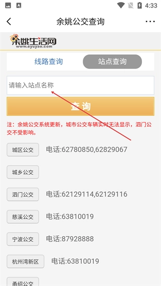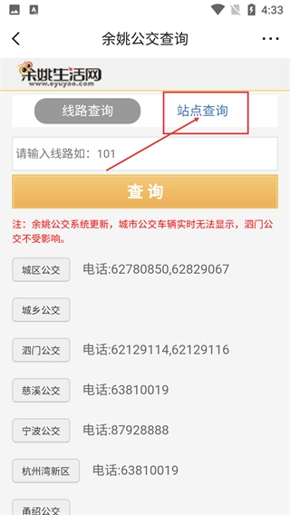 4、切换至【站点-查询】模式,输入目标站点名称后点击【查询】按钮,即可获取该站点的公交信息,同时请留意【余姚-公交-系统-更新】的相关提示。