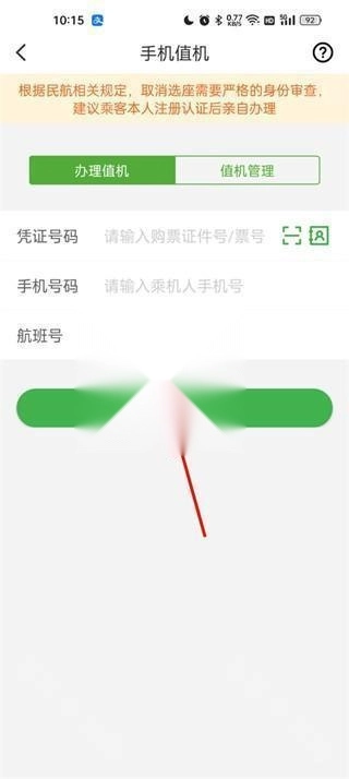 2、进入手机值机办理板块后,依次填写购票证件号或票号、乘机人手机号码、航班号,然后选择下一步。