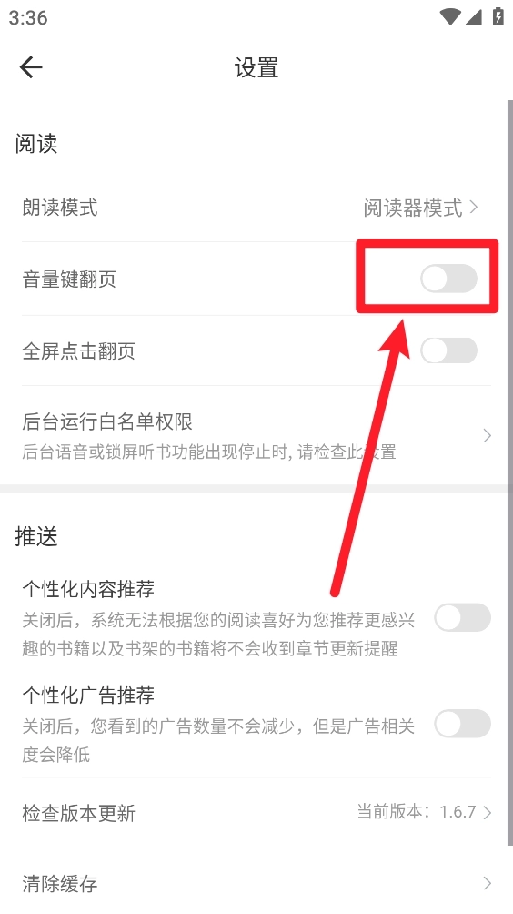 3、在设置页面打开"音量键翻页"的开关即可。