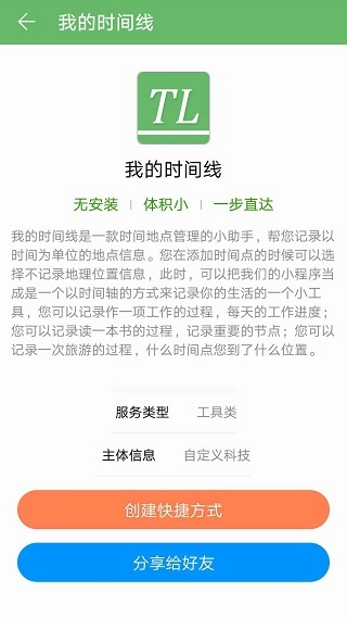 我的时间线是一款时间地点管理小助手,能帮您记录以时间为单位的地点信息。添加时间点时,您可以选择不记录地理位置信息,这时,我们的小程序就可以当作一个通过时间轴来记录您生活的小工具。