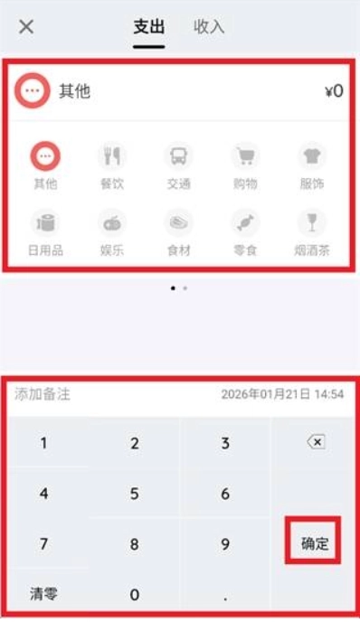 2、进入后在支出板块选择用途,输入金额,备注等,点击确定即可