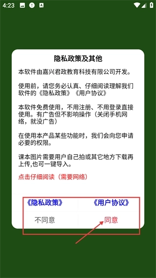 1、阅读【隐私政策】和【用户协议】,在知晓该软件支持免费免注册使用后,点击【同意】按钮,就能开启软件的学习功能。