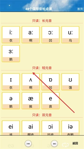 4、进入【48个国际音标点读】页面后,可选择【长元音】【短元音】等不同模块,点击相应音标即可开展点读学习,以此辅助掌握各类音标。