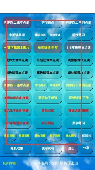 3、在功能界面里,能够选择【PEP四上课本点读】【中英读单词】这类对应的学习功能,根据自身需求点击来开启相应的学习内容。