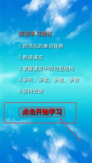 2、浏览页面呈现的英语学习建议后,点击【点击开始学习】按钮,即可进入软件的功能选择界面进行学习。