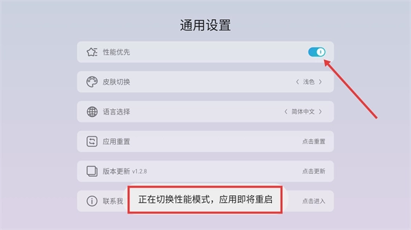 3、点击【性能优先】的开关后,应用会提示“正在切换性能模式,应用即将重启”。
