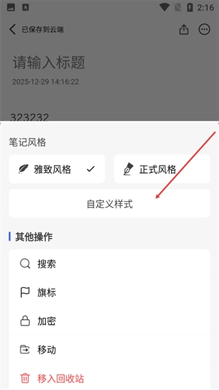3、选择“自定义样式”选项,进入笔记的风格编辑界面。