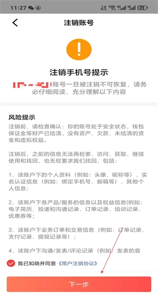 4、进入账号注销页面,仔细阅读注销手机号的相关提示以及风险告知,勾选对应的协议后,点击“下一步”按钮以继续后续操作。