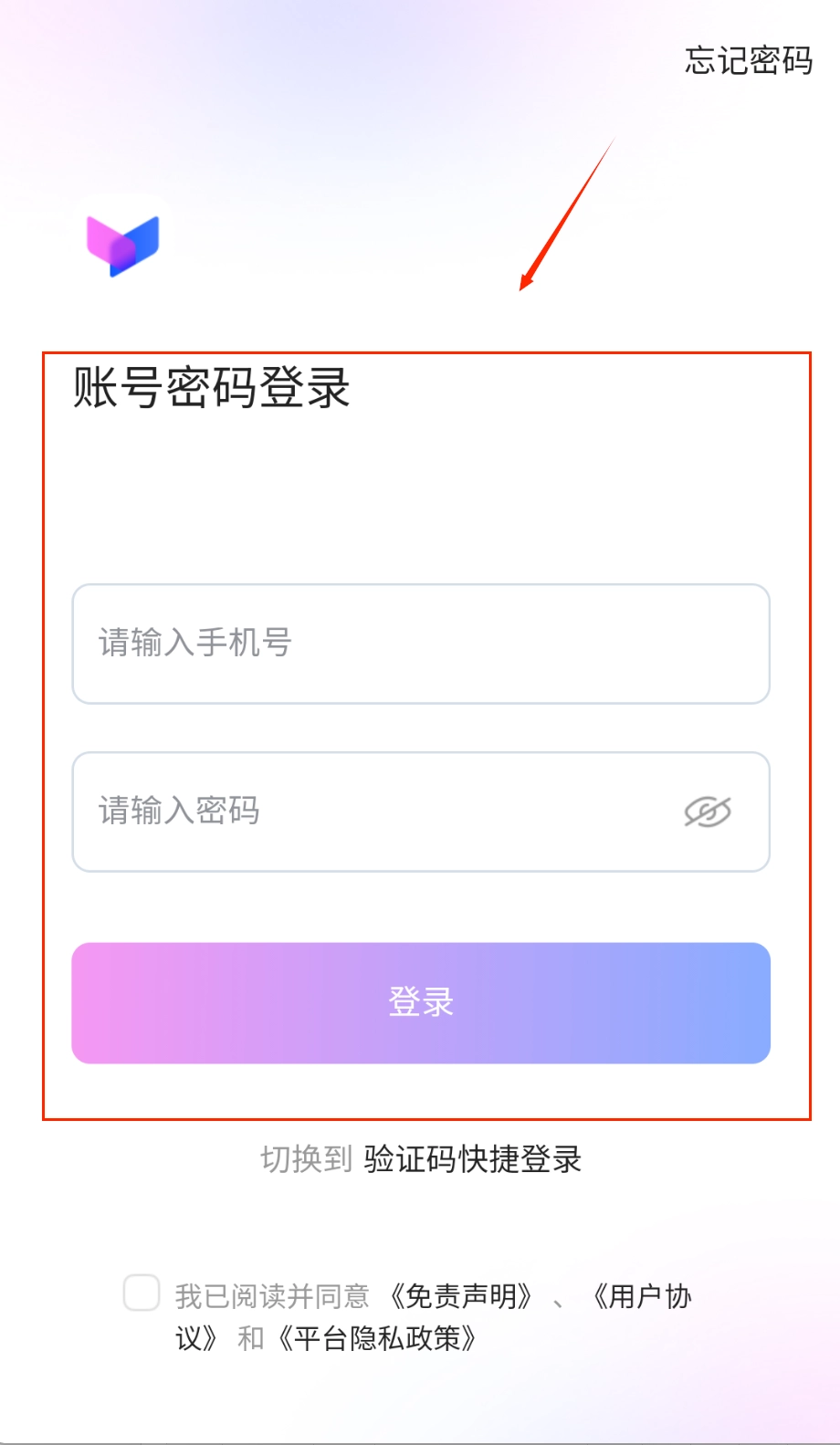 若想快速登录软件,可先打开应用进入登录界面,在账号密码登录对应的输入框中填入您的手机号码与密码,并且别忘了勾选同意相关协议政策。
