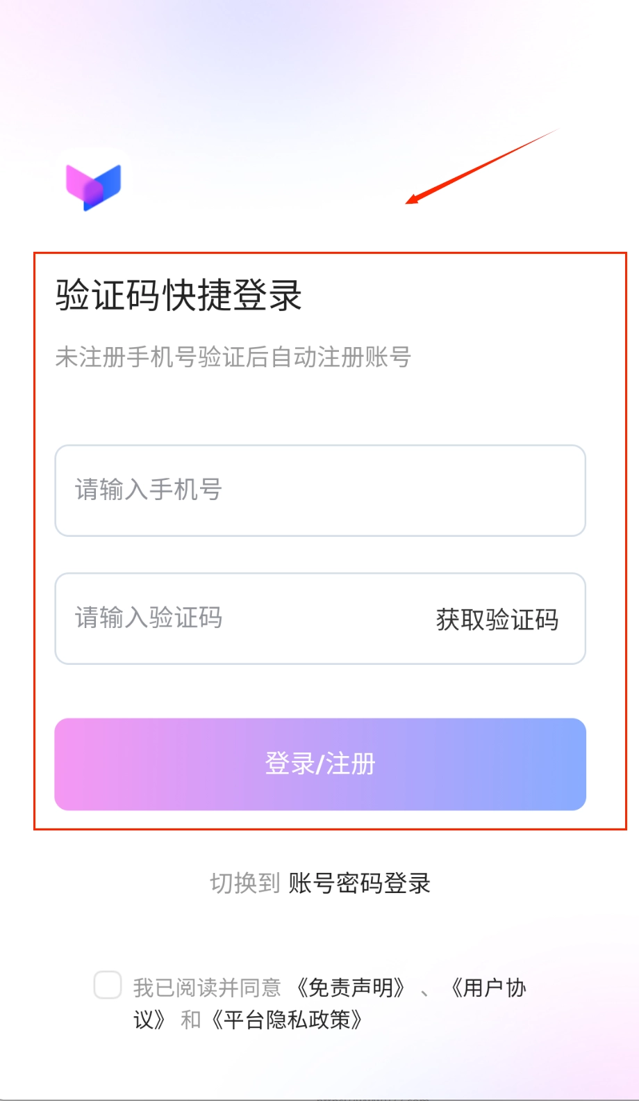 2、要是您觉得输入密码比较繁琐,也可以选用更方便的验证码登录方式,只需在手机号输入框填写您的号码,再点击获取验证码就行。