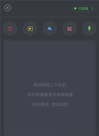 3、待连接成功后,屏幕会弹出遥控器界面。通过滑动操作可控制电视的上下左右方向,手机的音量键能够调节电视音量;点击屏幕对应位置可完成“确定”指令,双击则执行“返回”功能。界面上方设有多个功能按钮,分别对应电源开关、投屏、镜像、截屏以及语音控制等操作,输入指定的语音口令即可对电视播放进行控制。